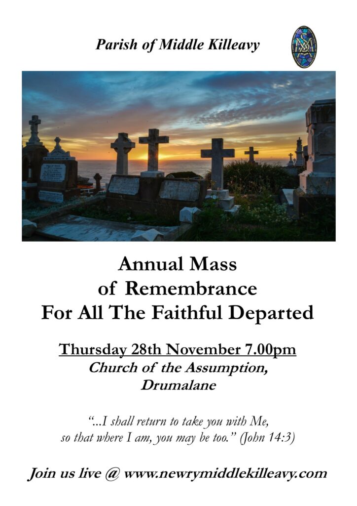 Our Annual Mass of Remembrance will take place on Wednesday 29th November. Those wishing to have a candle lit in remembrance of a loved one, should communicate the names (by email, telephone or “in person”) in the parish office before Mon 27th.